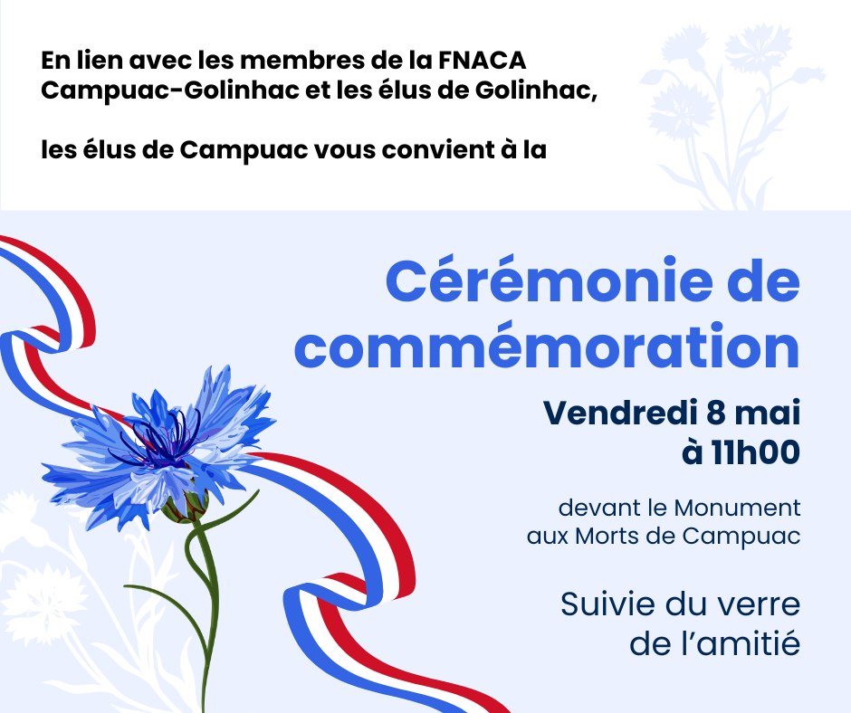 la municipalité de Campuac vous invite à participer à la cérémonie de commémoration de la Victoire du 8 mai 1945.