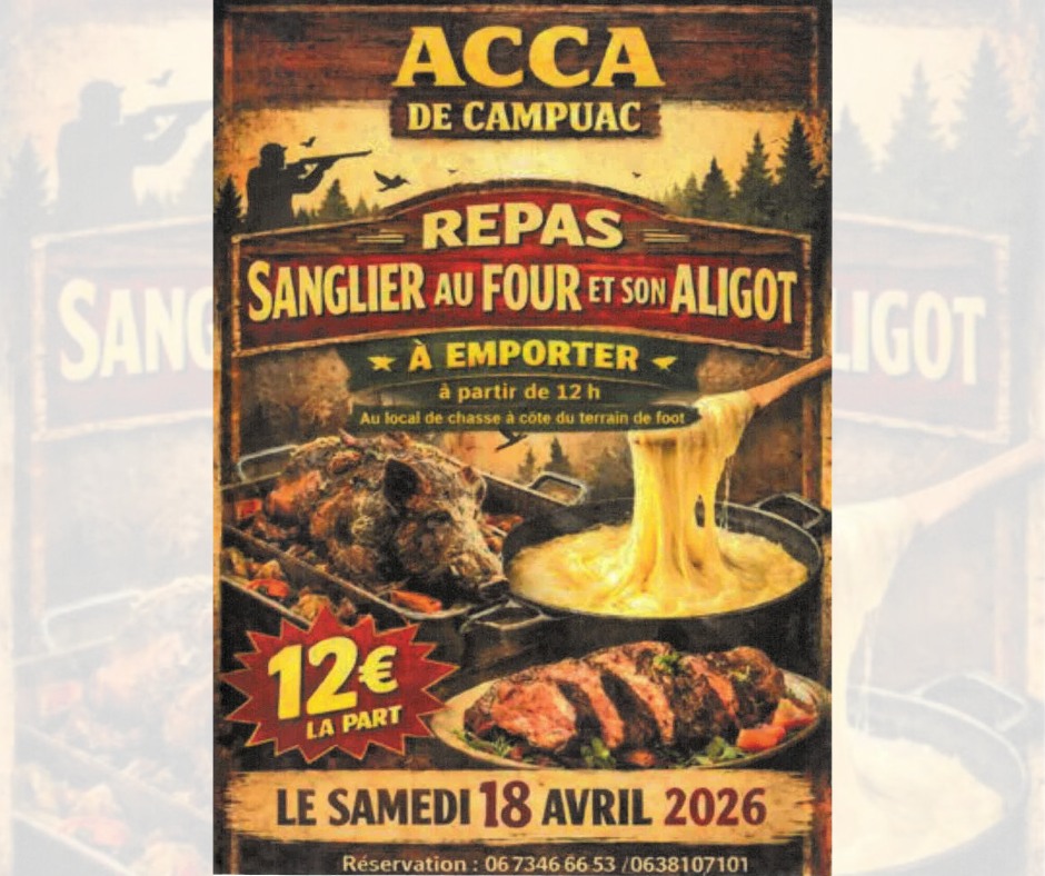 L’ACCA de Campuac vous propose un moment gourmand à ne pas manquer avec son traditionnel sanglier au four et son aligot