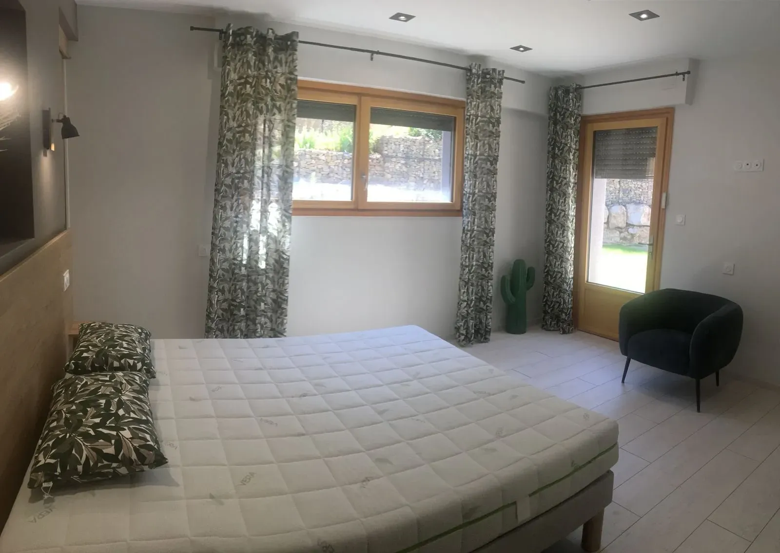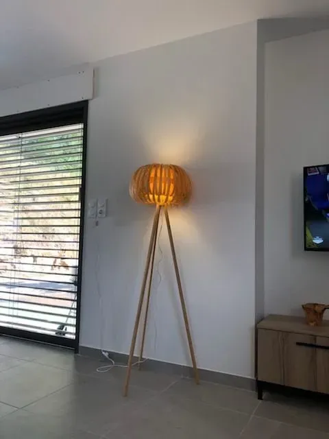 1 chambre (1 lit 160), salle d’eau, buanderie (lave-linge), coin-cuisine (lave-vaisselle)/séjour (canapé convertible, télévision), chauffage complet électrique/climatisation réversible, terrasse (16 m²) et terrain (40 m²) privés non clos, salon de jardin, barbecue, parking privé, location draps. Linge de toilette non fourni.